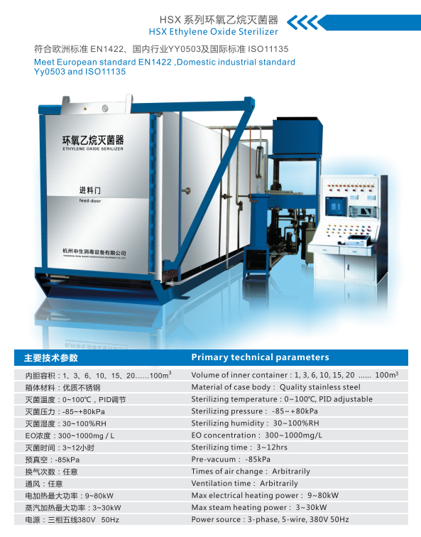 環(huán)氧乙烷滅菌器是通過使用環(huán)氧乙烷氣體或混合氣體,在一定的溫度、壓力、濕度條件下,對封閉在滅菌室內(nèi)的物品進行熏蒸滅菌的用設(shè)備。它具有穿透力強、殺菌效果好,且又能在較低的溫度、壓力條件下滅菌,對物品無腐蝕、無損害等特點,使它廣泛應用于醫(yī)療器械、衛(wèi)生用品等滅菌。
